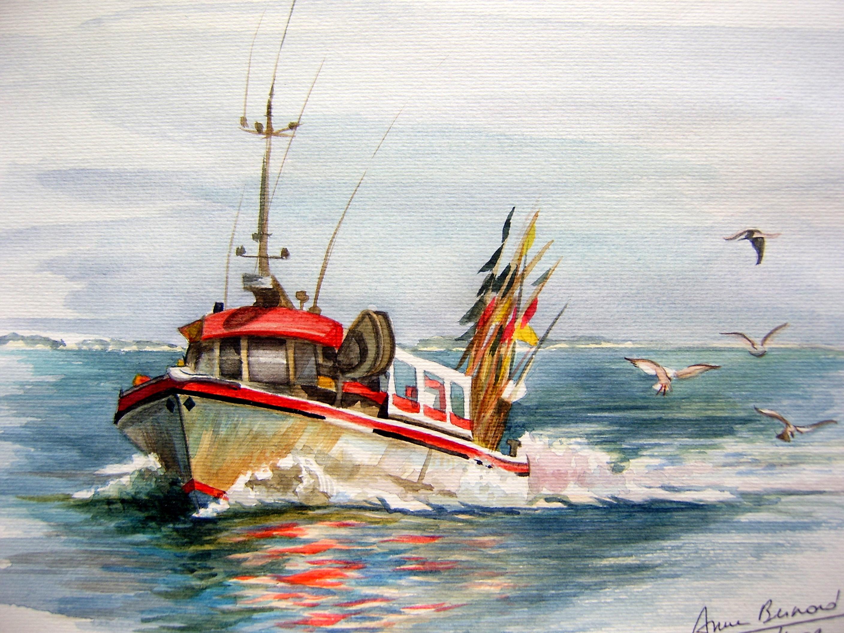 Bâteau de pêche Taille : 21 x 29 cm Technique : Aquarelle Prix : Sur demande Commander -